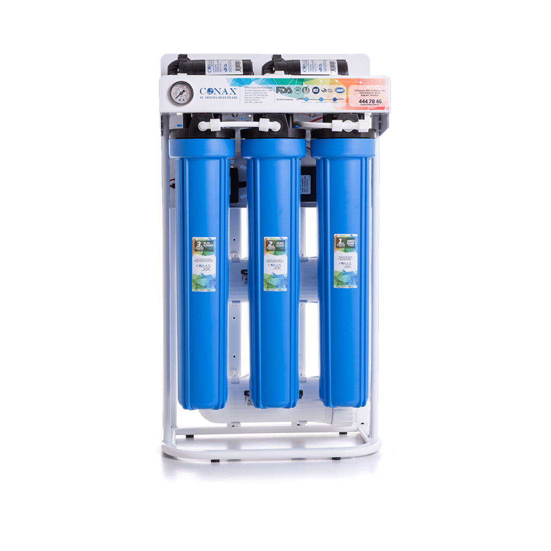 İşyeri su arıtma cihazları içinde en yüksek kapasiteli olan Conax 600 GPD su arıtma cihazı, ters osmoz su arıtma teknolojisine sahip mükemmel tasarımlı bir cihazdır. İşyerlerinde büyük bir oranda tasarruf sağlayan Conax 600 GPD su arıtma cihazı, 600 GPD membran filtrelidir. Saatte 47 LT su arıtan cihaz 600 GPD ve 80 LT basınçlı tankı ile günde 60 damacana su arıtmaktadır. Bu kapasitesi ile kendisini iki aydan daha kısa sürede amorti ederek şirketlere tasarruf sağlamaktadır. Sağlıklı ve güzel olmak için suyun ne kadar hayati bir içecek olduğu herkes tarafından bilinen bir gerçektir. Hava kadar gerekli bir yaşam kaynağı olarak içilen su sağlıklı ve kaliteli olmalı, her türlü kalıntı ve mikroorganizmalardan arınmış olmalıdır. Conax 600 GPD işyeri su arıtma cihazı, bir işyerinin ihtiyacı olan tüm içme suyunu en ekonomik şekilde sağlayan fonksiyonel bir cihazdır. PH seviyesi 8.50 olan ve yumuşak olduğu kadar lezzetli bir su elde eden cihaz, alanında sektörün en iyi ve en yüksek kapasiteli su arıtma cihazıdır.
